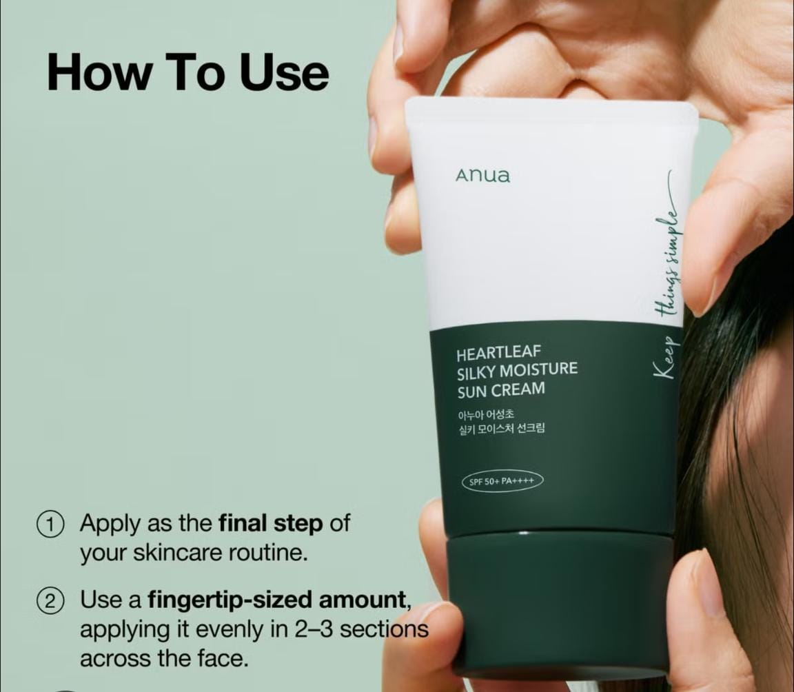 Anua Heartleaf Silky Moisture Sun Cream ππThis SPF 50+ PA++++ sunscreen provides strong protection against UVA and UVB rays βοΈ. Infused with heartleaf extract π, itβs perfect for calming and soothing sensitive skin. The silky, lightweight texture absorbs smoothly, leaving no white cast or sticky residue β¨. It hydrates while giving a natural, radiant finish π§πβperfect for everyday use!